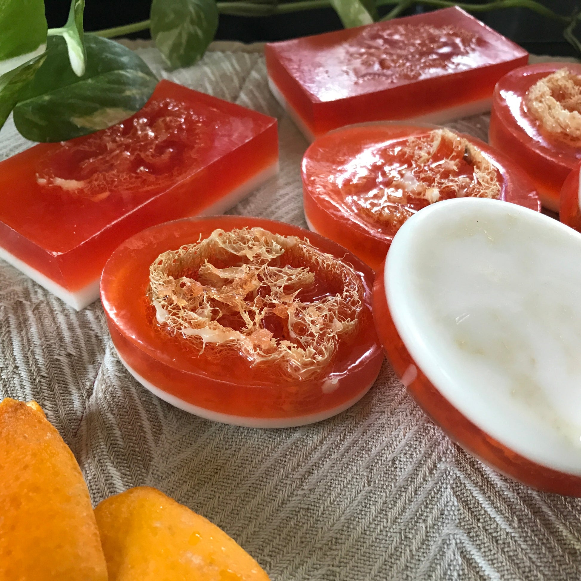Natural loofah scrubbing soap is fun and full of citrusy delight! The soap has a natural loofah that is great for that once in a week scrub or your everyday foot scrub, after a tiring day.